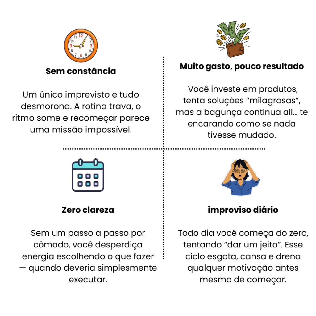 Já tentou seguir planners, aplicativos ou listas prontas, mas não conseguiu manter nada por mais de alguns dias? Gostaria de ver sua casa em ordem rapidamente — leve, organizada e com cara de “cuidada” — sem esforço e sem perder horas do seu dia?